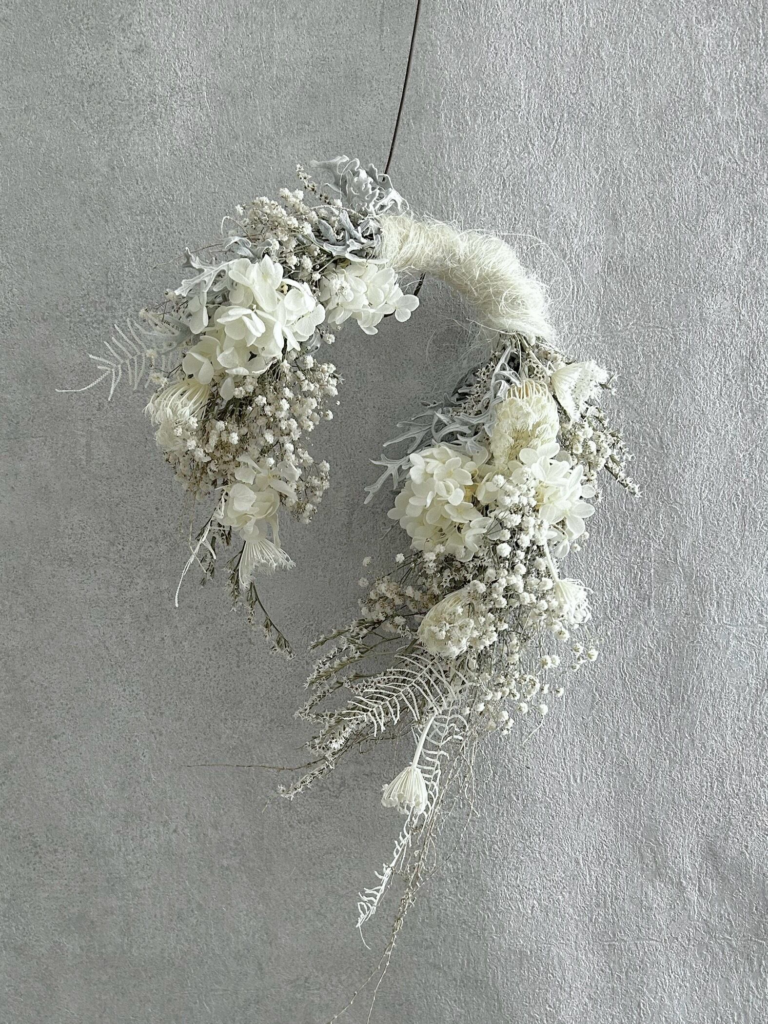 暑い日差しを和らげる雲のようなリースをイメージして作りました。 お部屋を優雅な雰囲気でやさしく包み、涼やかな夏の雲を感じながらリラックスタイム♪